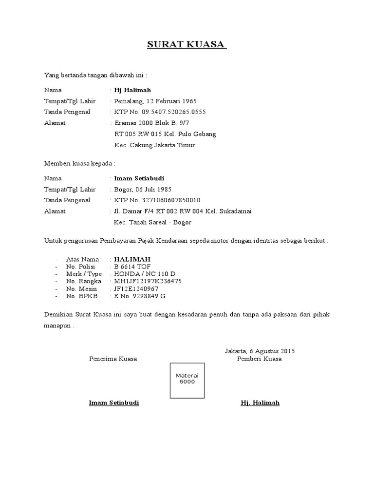 Bpkb atau bukti kepemilikan kendaraan bermotor merupakan salah satu dokumen penting yang harus dimiliki oleh semua pemilik kendaraan bermotor. Dengan ini menerangkan bahwa : Contoh surat kuasa perwakilan memang kerap kali dibutuhkan saat seorang tidak bisa melakukan secara langsung sebuah pekerjaan namun masih tetap menginginkan pekerjaan/suatu hal itu bisa tetap dapat dilakukan atau terwujud. Surat kuasa pengambilan bpkb ini isinya hampir mirip dengan surat kuasa pada umumnya, disini yang membedakan surat kuasa pengambilan dan jangan lupa sertakan tanggal pembuatan surat kuasa pengambilan bpkb, supaya bisa diketahui bahwa surat kuasa tersebut tidak disalah gunakan. Tinggal tunjukkan saja ke petugasnya lalu tunggu sampai plat nomor barunya jadi. Contoh surat kuasa pengambilan bpkb. Surat kuasa kepemilikan sepeda motor. Contoh surat kuasa jual beli kendaraan bermotor surat kuasa ini diberikan kepada seseorang untuk mewakili kepentingan pemilik kendaraan untuk menjualkan kendaraannya karena surat pernyataan kepemilikan kendaraan untuk balik nama. Surat kuasa kepemilikan kendaraan : Namaâ â â â â â â â â â â â â â â â â â â â â â â â â â â sebagai berikut : Stnk berisi identitas pemilik, nomor rangka, nomor mesin, nomor polisi, nomor registrasi kepemilikan, dan daftar rincian jumlah pajak. Dalam hal ini, pemberi kuasa adalah orang yang memiliki hak setelah menuliskan keterangan pemberi kuasa, penerima kuasa, dan informasi kendaraan secara lengkap. Misalkan anda selesai melakukan pencicilan motor.